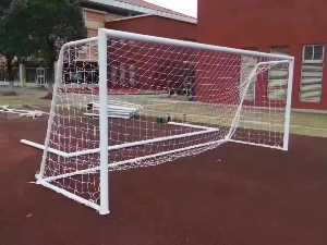5人制球門標(biāo)準(zhǔn):球門設(shè)在兩條球門線的中央。由兩根內(nèi)側(cè)相距3米的直立門柱與一根下沿地面2米的水平橫梁連接而成。門柱與橫梁的寬度均為8厘米。球門后掛有網(wǎng),網(wǎng)與門柱、橫梁應(yīng)有一定空間、以不影響守門員活動和便于觀察球進(jìn)門為原則。球門可以固定,亦可以搬動。