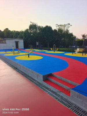3、底層攤鋪:用橡膠顆粒和專用膠水按8:1重量配比(選的顆粒不同,膠水配比也不同),用攪拌器械在攪拌區(qū)攪拌均勻,用送料車送到預(yù)先劃好界線處,用刮尺攤鋪,用滾碾子壓實。待底層固化后開始面層攤鋪。經(jīng)過二至三小時的固化,再次用滾碾子壓實,不平整的地方用鏝刀拍打平整,如鏝刀、滾碾子粘顆粒,沾少許稀釋劑起到光滑的作用。
